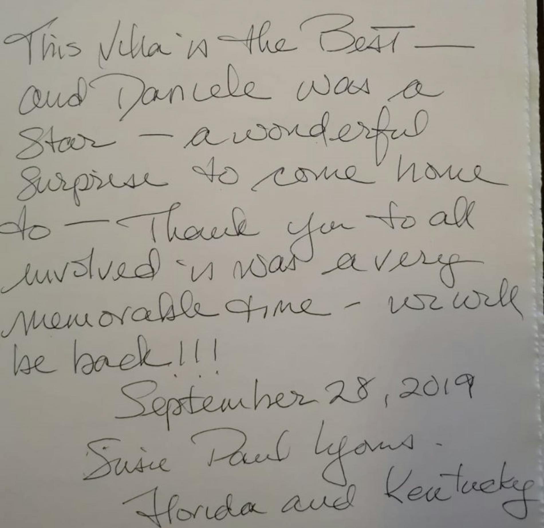 "This villa is the best. And Daniele was a star. A wonderful surprise. Thank you to all, it was a very memorable time. We will be back!!!"