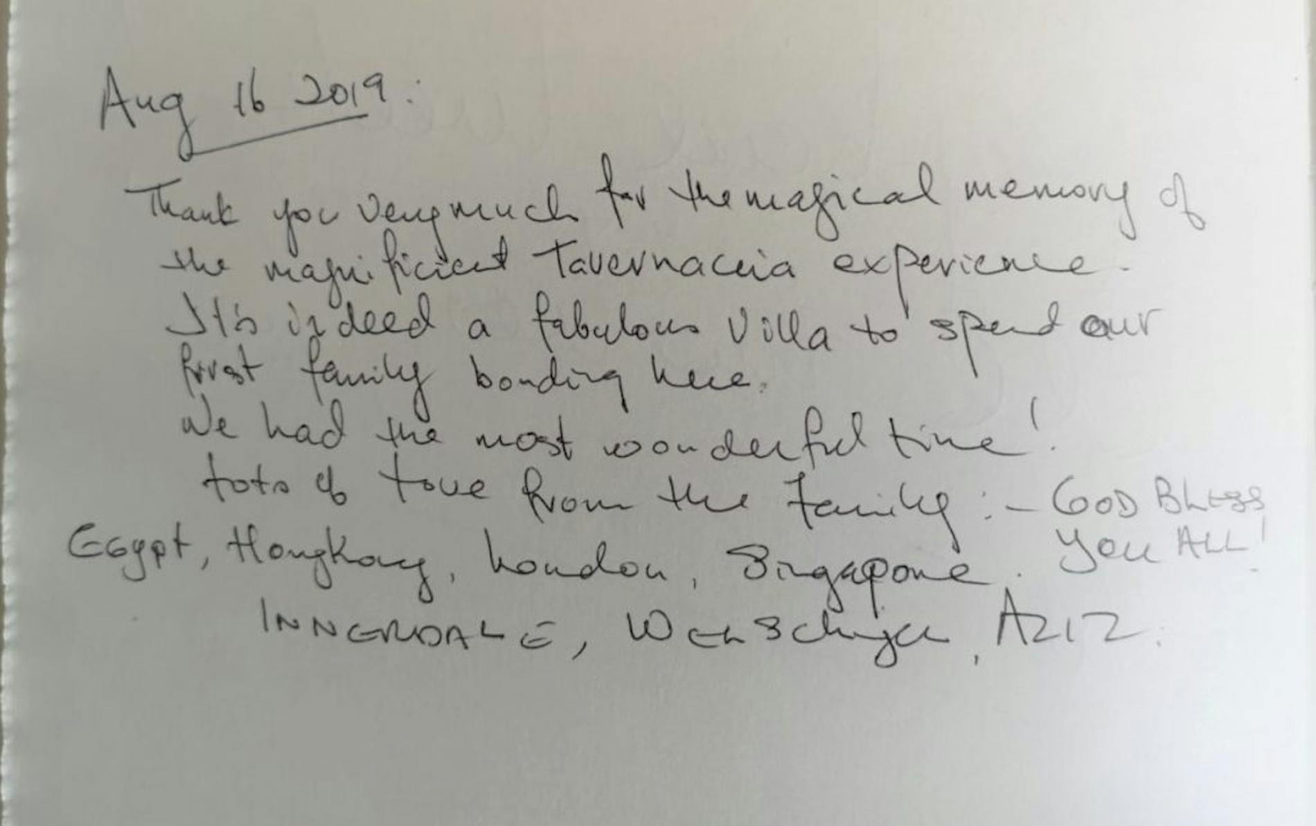 “Thank you very much for the magical memory of the magnificent Tavernaccia experience. It’s indeed a fabulous villa to spend our first family bonding here. We had the most wonderful time! Lots of love from the family: God Bless."