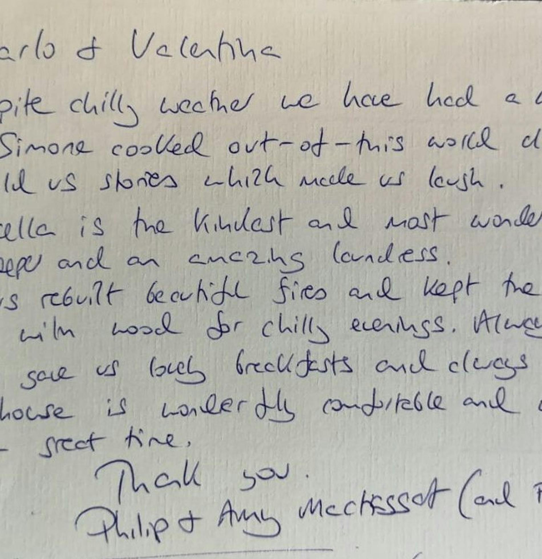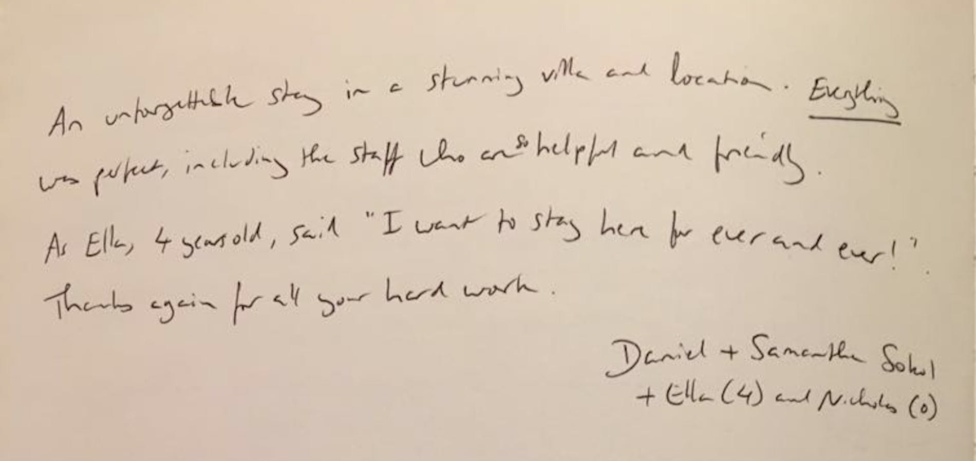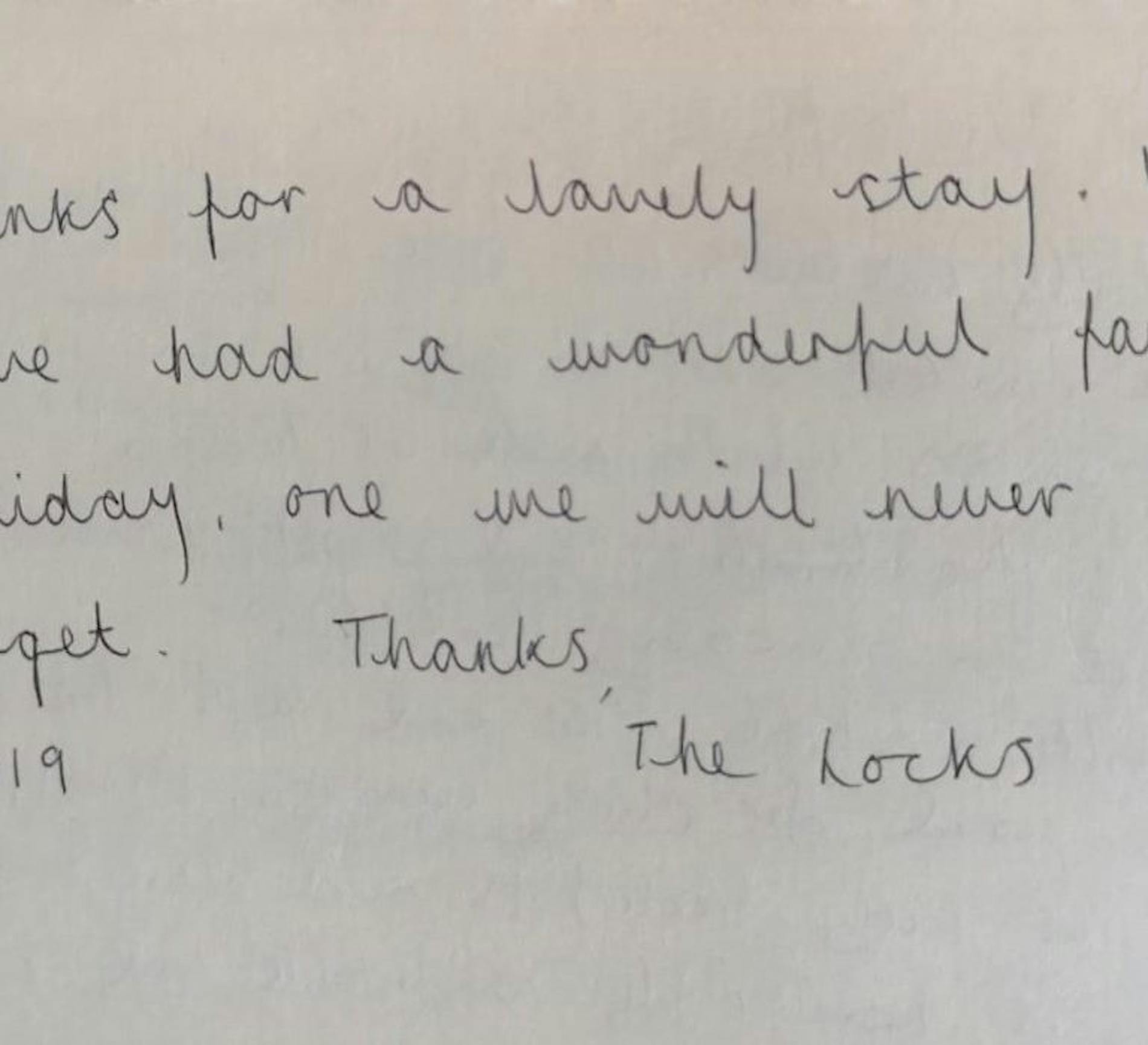 "Thanks for a lovely stay, we have had a wonderful family holiday, one we will never forget. Thanks."