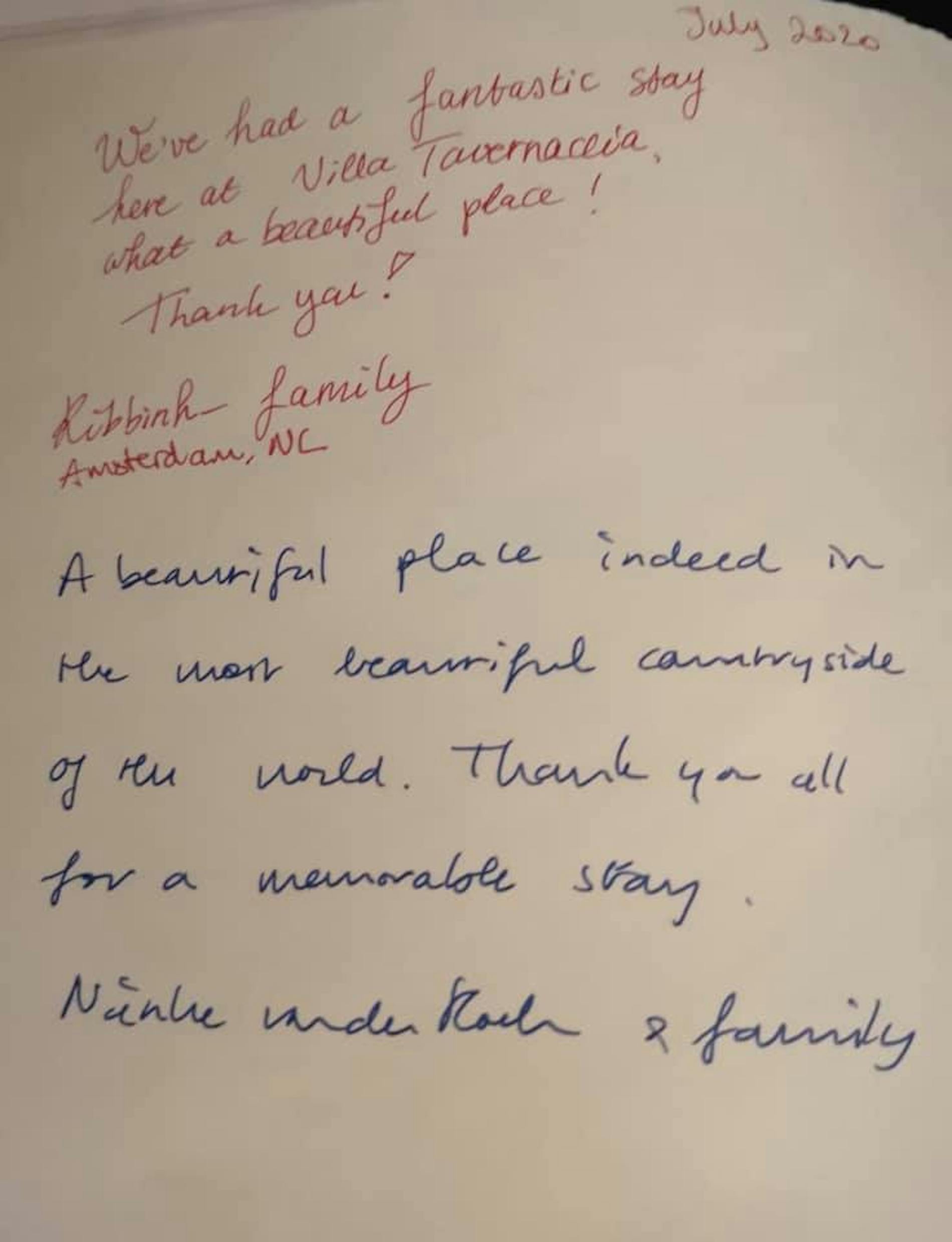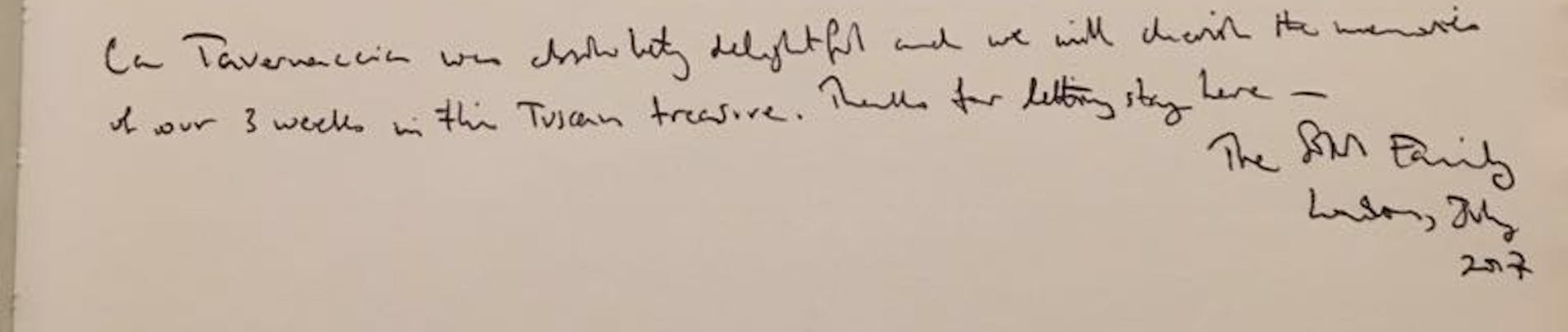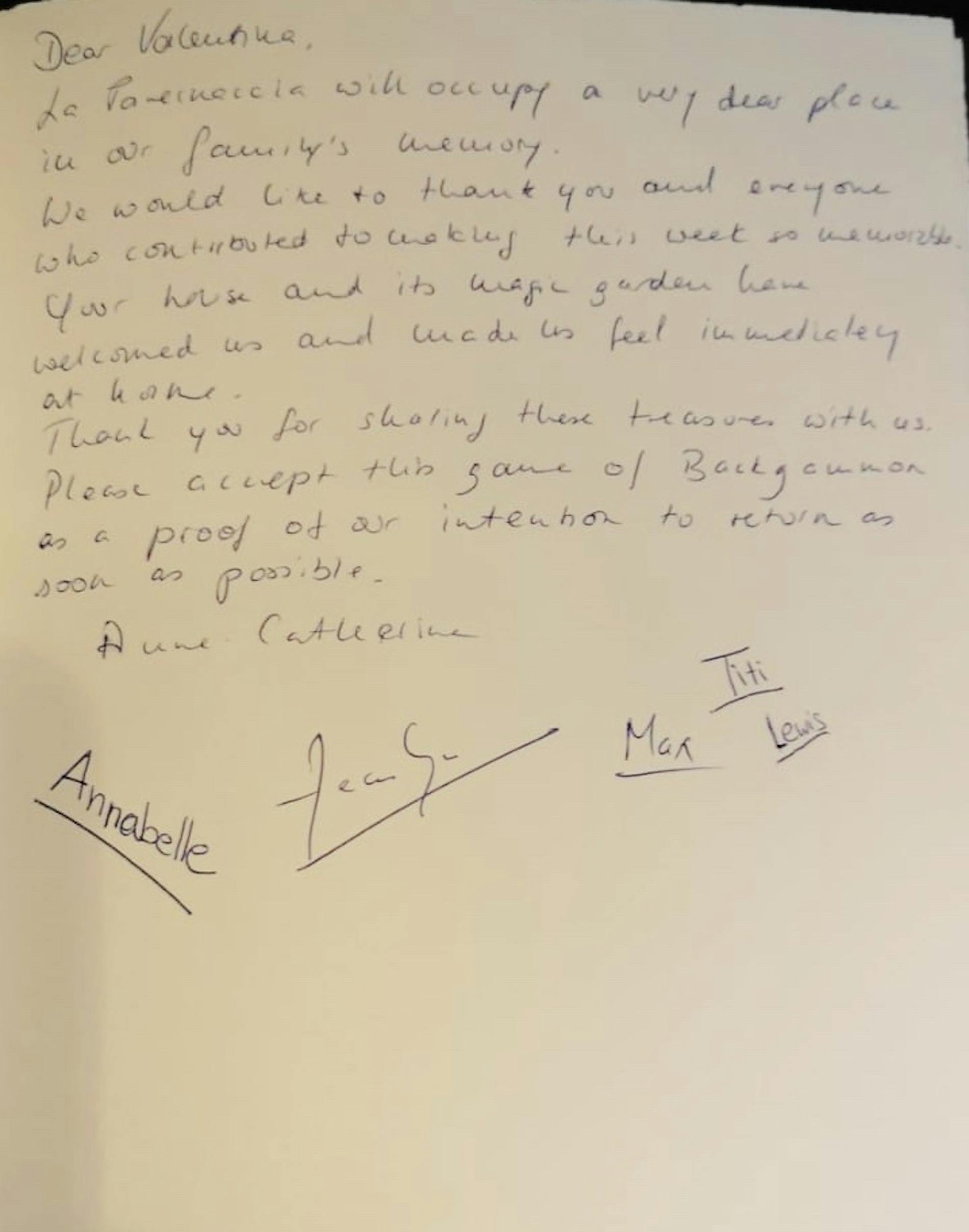 "Dear Valentina, la Tavernaccia will occupy a very dear place in our family’s memories. We would like to thank you and everyone who contributed to making this week so memorable. Your house and its magic garden have welcomed us made us feel immediately at home. Thank you for sharing this treasure with us. Please accept the game of Backgammon as a proof or our intention to return as soon as possible."
