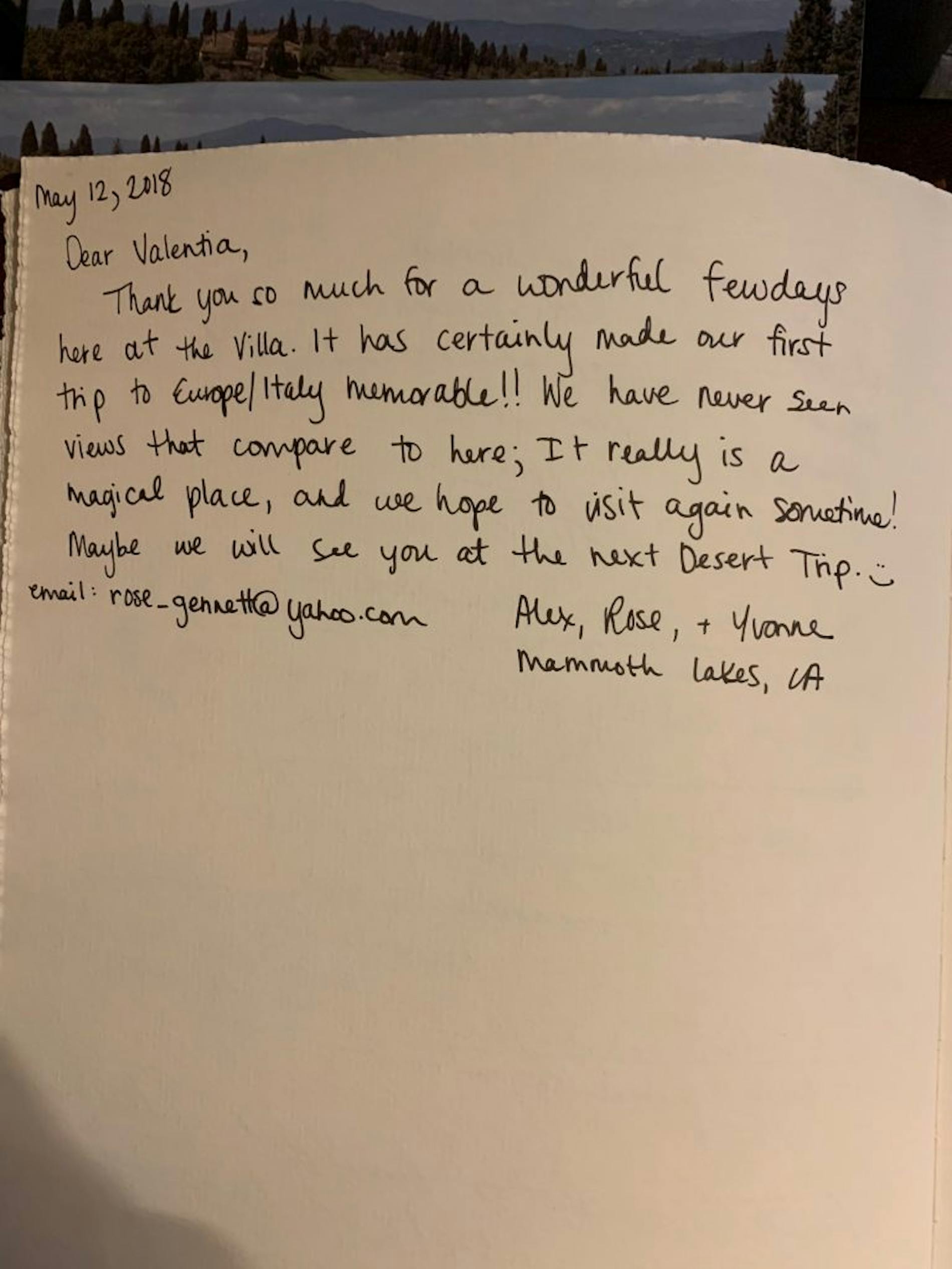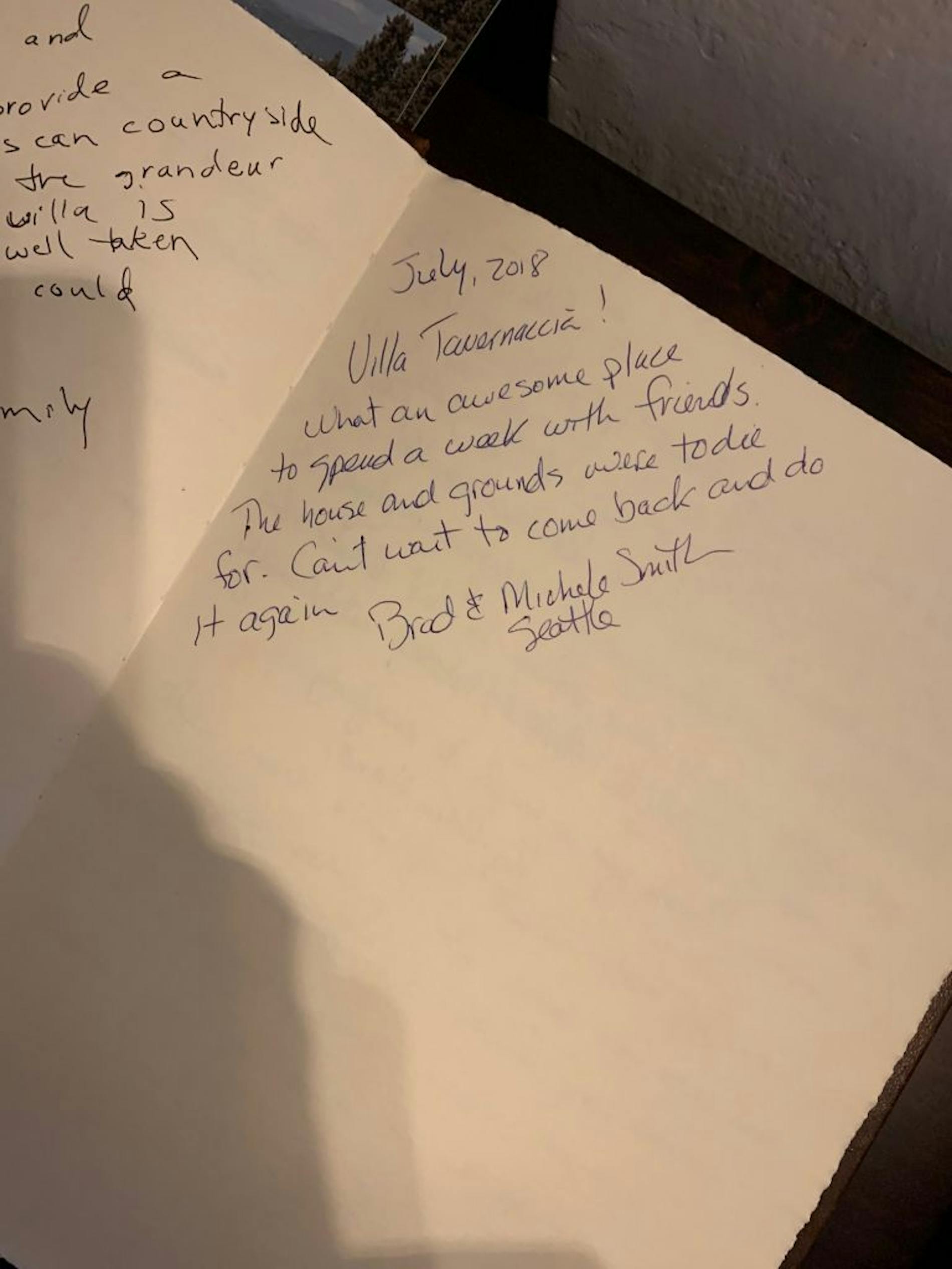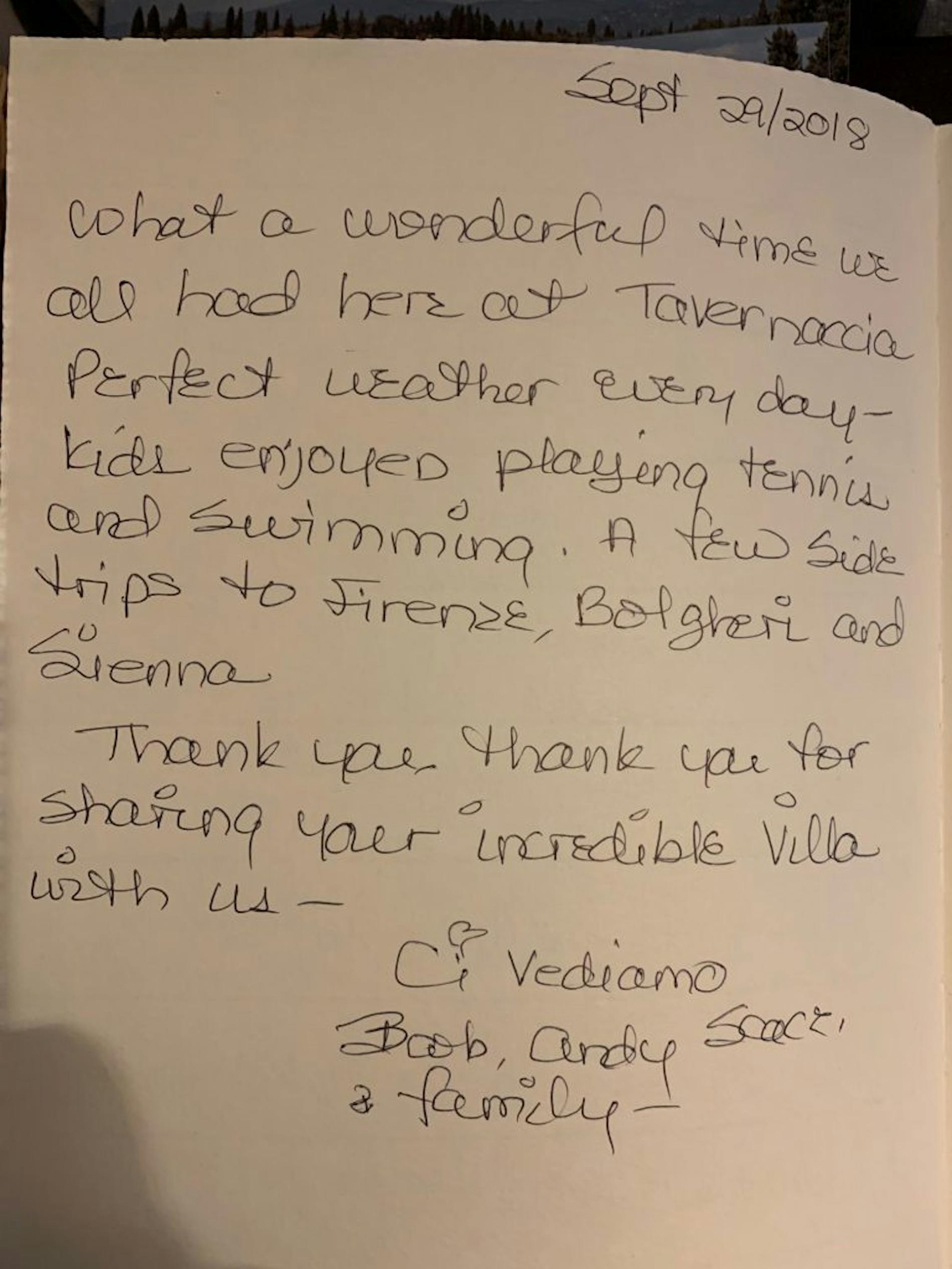 "Dear Valentina, la Tavernaccia will occupy a very dear place in our family’s memories. We would like to thank you and everyone who contributed to making this week so memorable. Your house and its magic garden have welcomed us made us feel immediately at home. Thank you for sharing this treasure with us. Please accept the game of Backgammon as a proof or our intention to return as soon as possible."