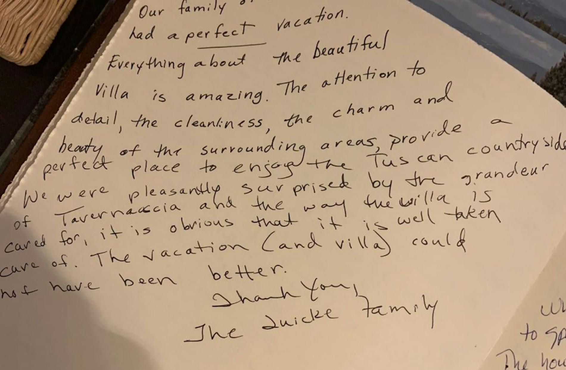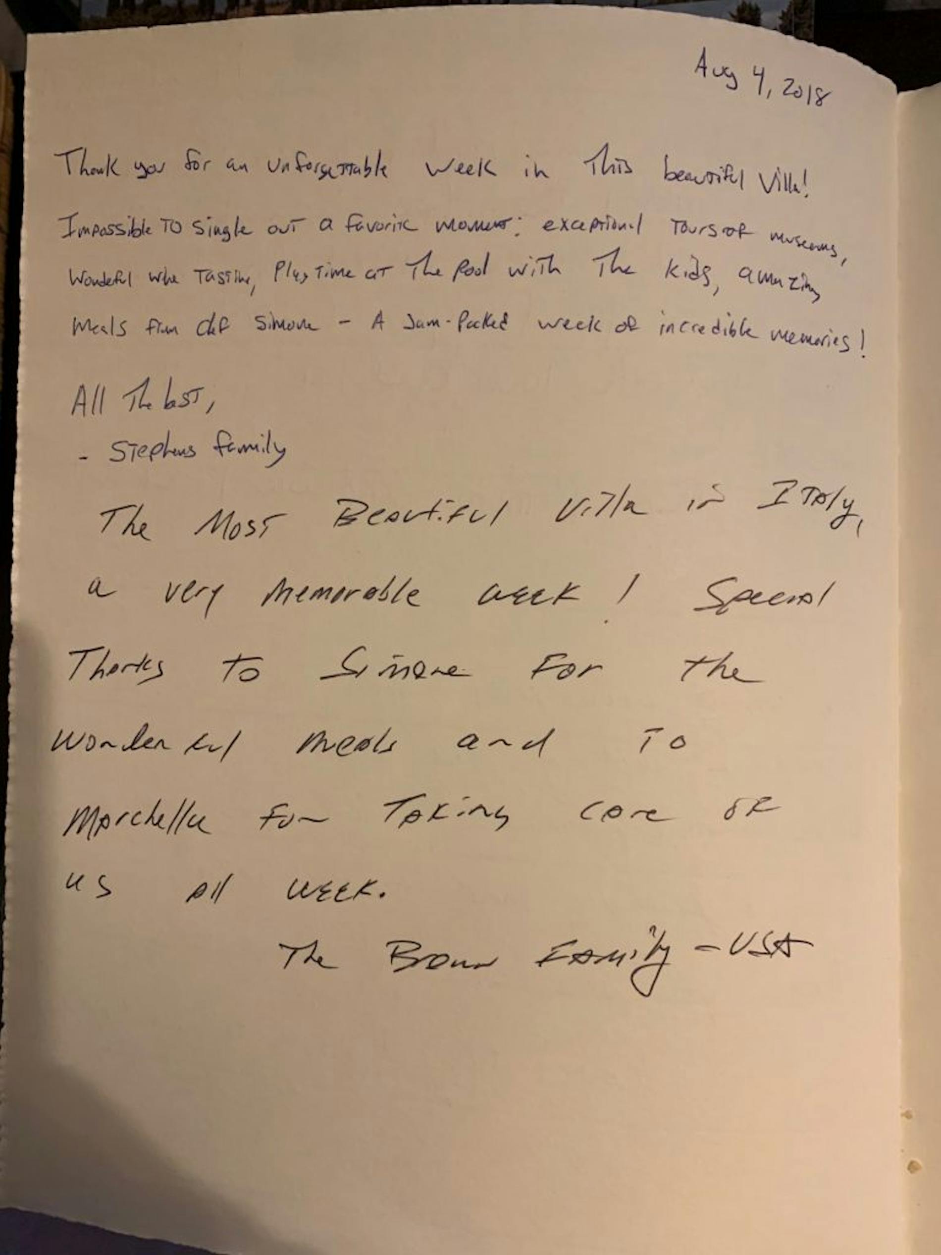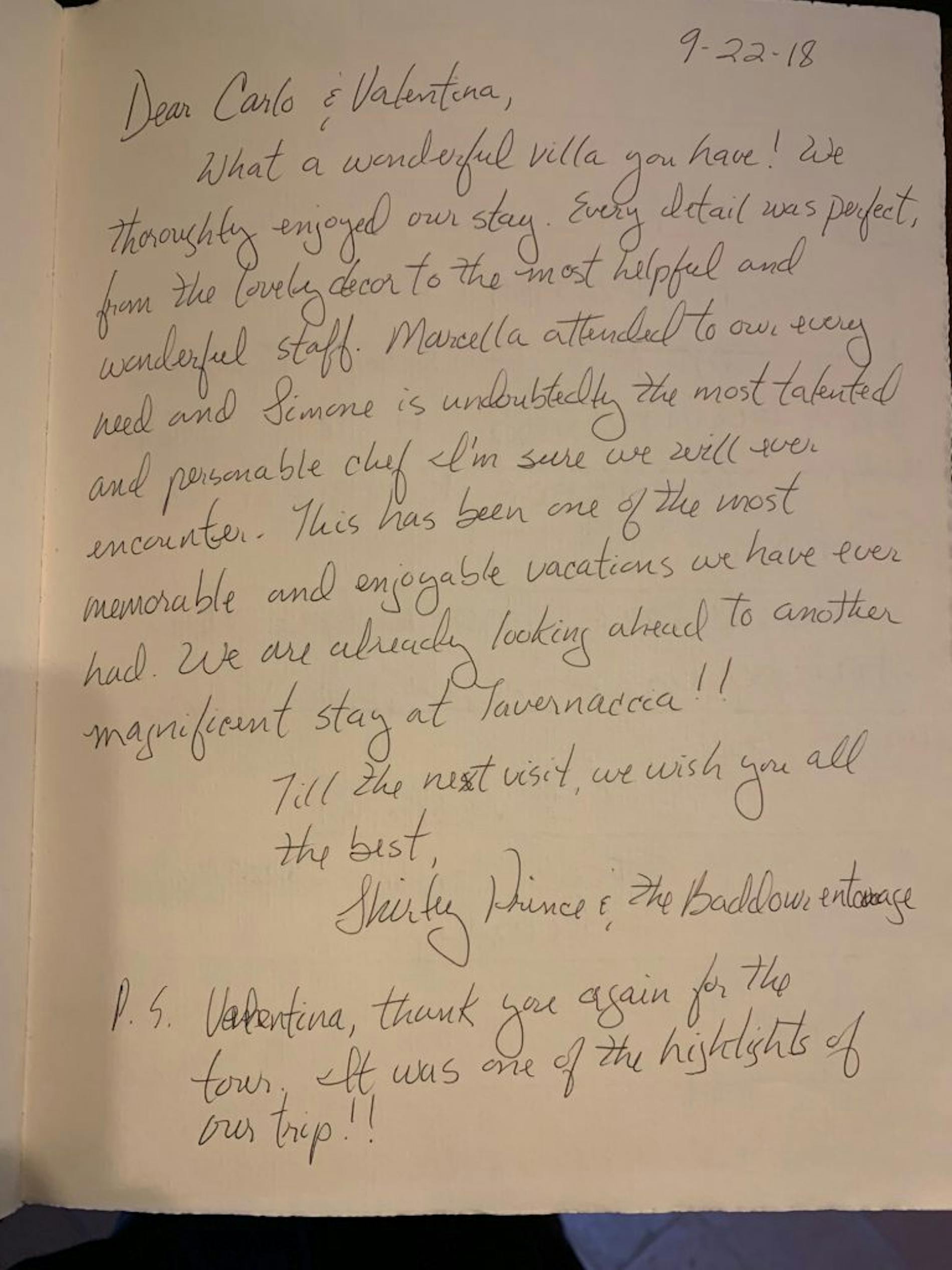 "Dear Carlo and Valentina, what a wonderful Villa you have! We enjoyed our stay. Every detail was perfect, from the lovely decor to the most helpful and wonderful staff. Marcella attended to our every need and Simone is undoubtably the most talented chef I’m sure we will ever encounter. This has been one of the most memorable and enjoyable vacations we have ever had. We are already looking ahead to another magnificent stay at villa Tavernaccia. Till the next visit we wish you all the best."