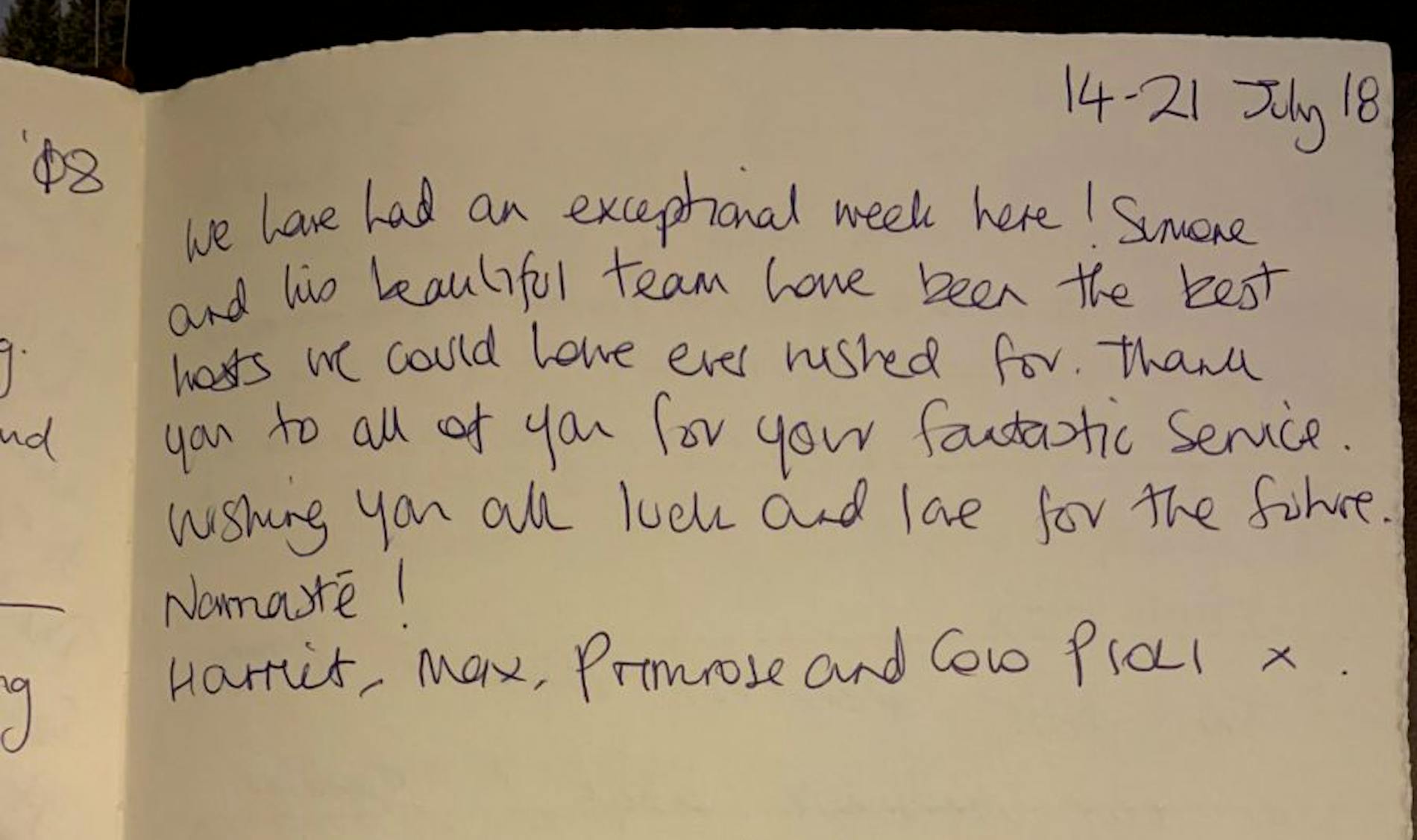 "Thank-you for spoiling us this week, your smile each morning was the perfect way to start the day. We’ll miss you. Come and visit us and we’ll make breakfast for you!"