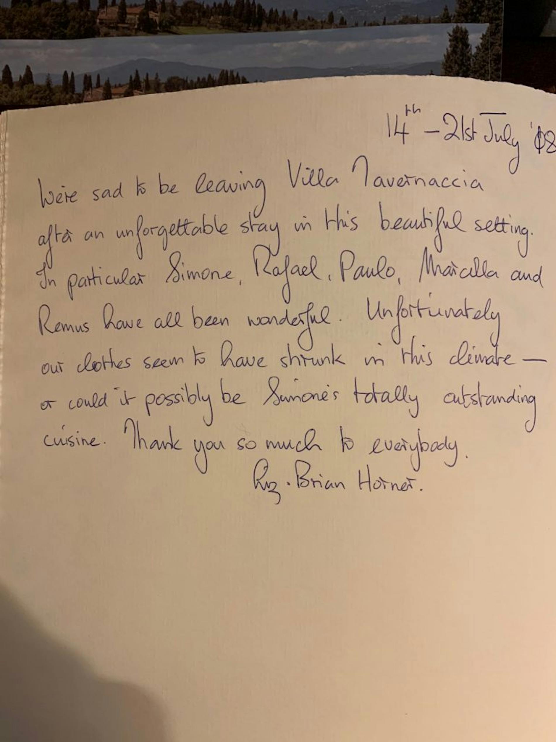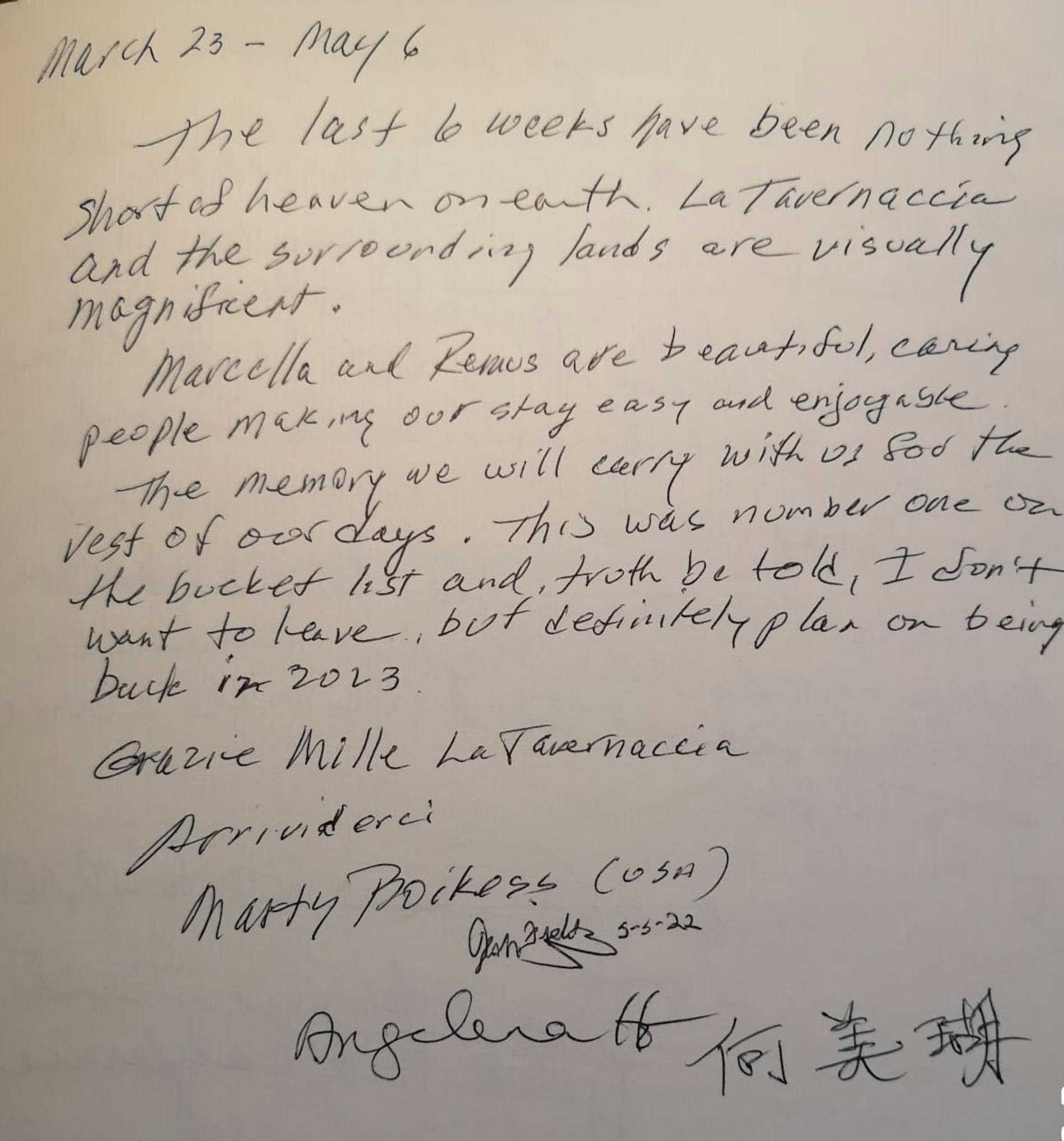 "Simone, Marcella e Remus, you are all divine, à la prochain! A big “baci” for a glorious week in Tuscany with great fondness."