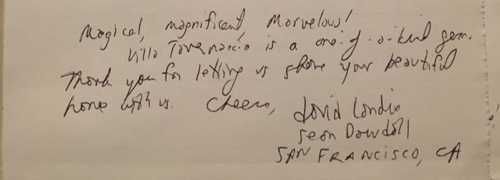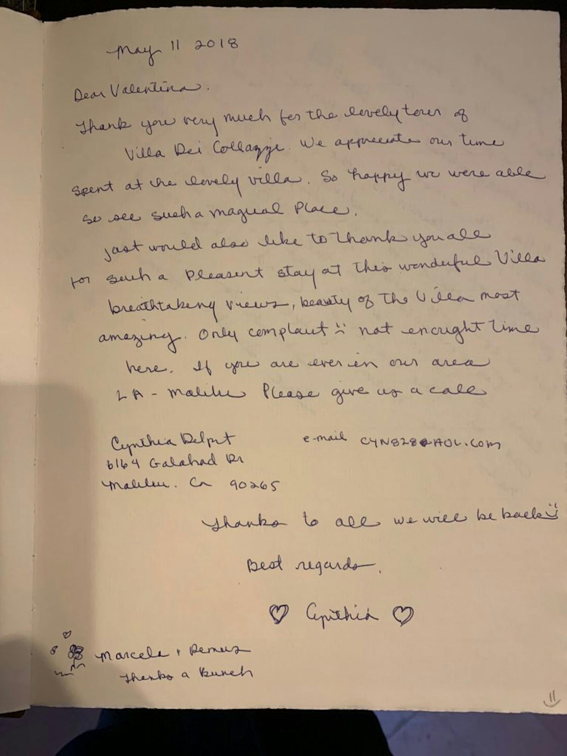 "Marcella, thank-you for making this week such a special one. Your thoughtfullness and warmth will be remembered for a very long time! We had a wonderful week! Much love to you!"