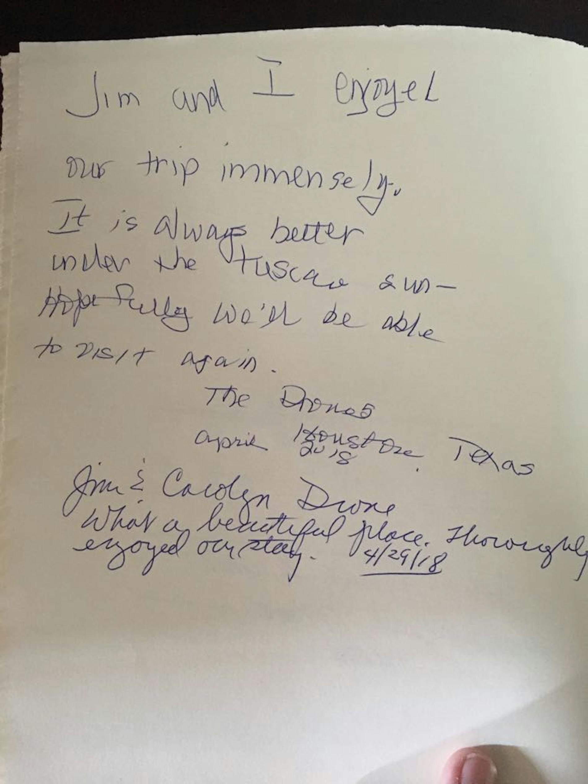 "Jim and I enjoyed our trip immensely. It is always better with the Tuscan sum. Hopefully we’ll be able to visit again."