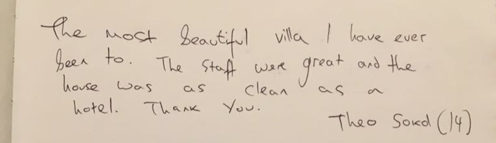 "The most beautiful villa I have ever been to. The staff were great and the house was as clean as a hotel. Thank you."