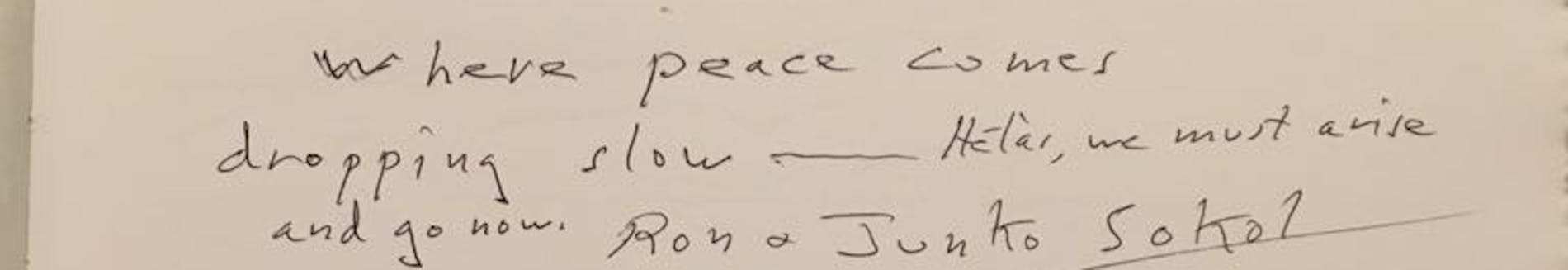 "Where peace comes dropping slow… We must arise and go now."