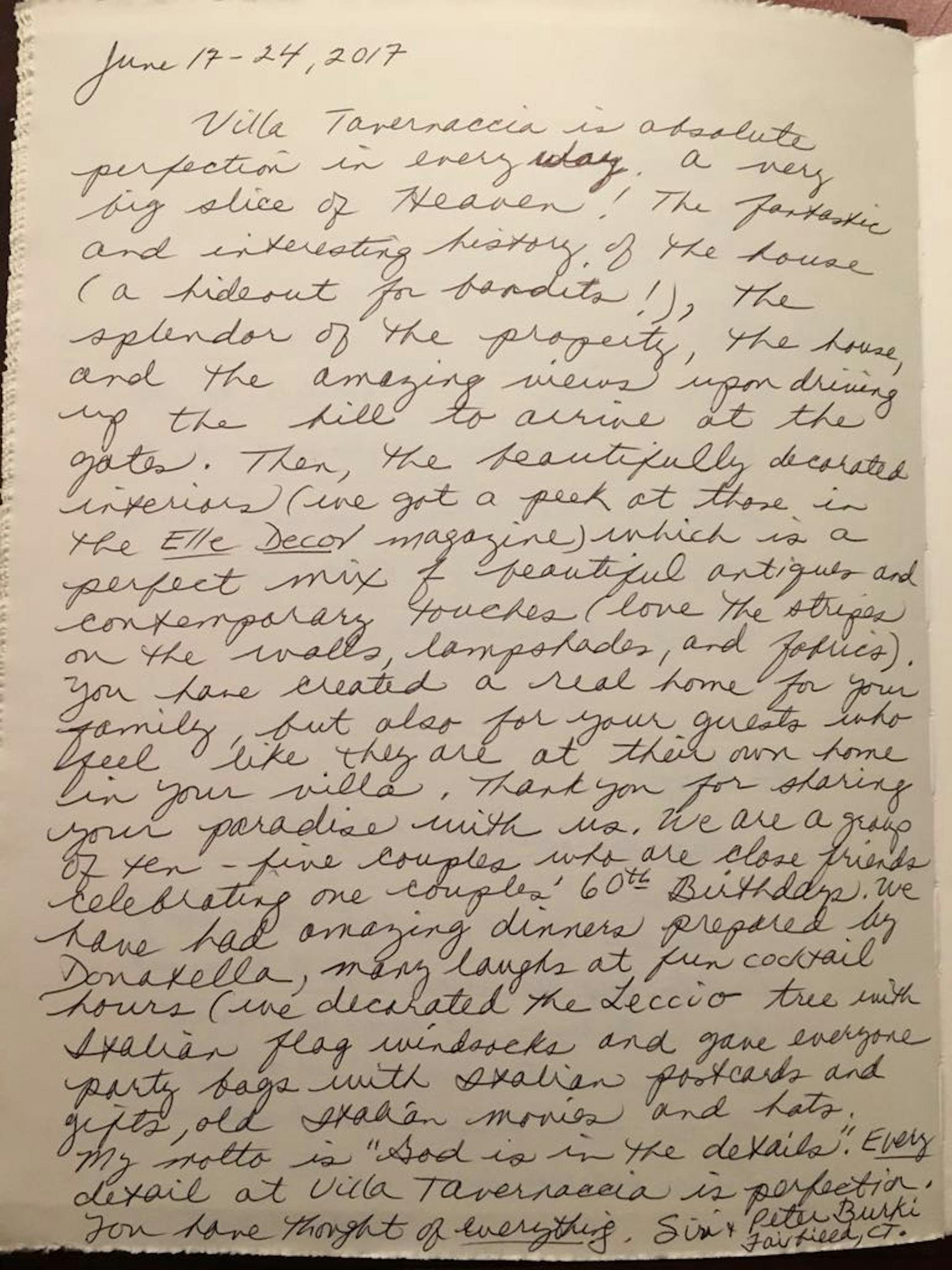 "Villa Tavernaccia is absolute perfection in every way. A very big slice of heaven! The fantastic and interesting history of the house (a hideout for bandits!), the splendor of the property, the house, the amazing views upon driving up the hill to arrive at the gates. Then the beautifully decorated interiors (got a peek at those in Elle Decor magazine) which is a perfect mix of beautiful antiques and contemporary touches (love the stripes on the walls, lampshades). You have created a real home for your family but also for your guests who feel like they are at their own home in your villa. Thank you for sharing your paradise with us. We are a group of ten – five couples- who are close friends celebrating one couple 60th birthday. We have had amazing dinners prepared by Donatella , many laughs at fun cocktails hours, (we declared the Leccio tree the Italian flag windlocks and gave everyone party bags with Italian postcards and gifts, old Italian movies and hats. My motto is "God is in the details”; every detail at Villa Tavernaccia is perfection. You have thought of everything."