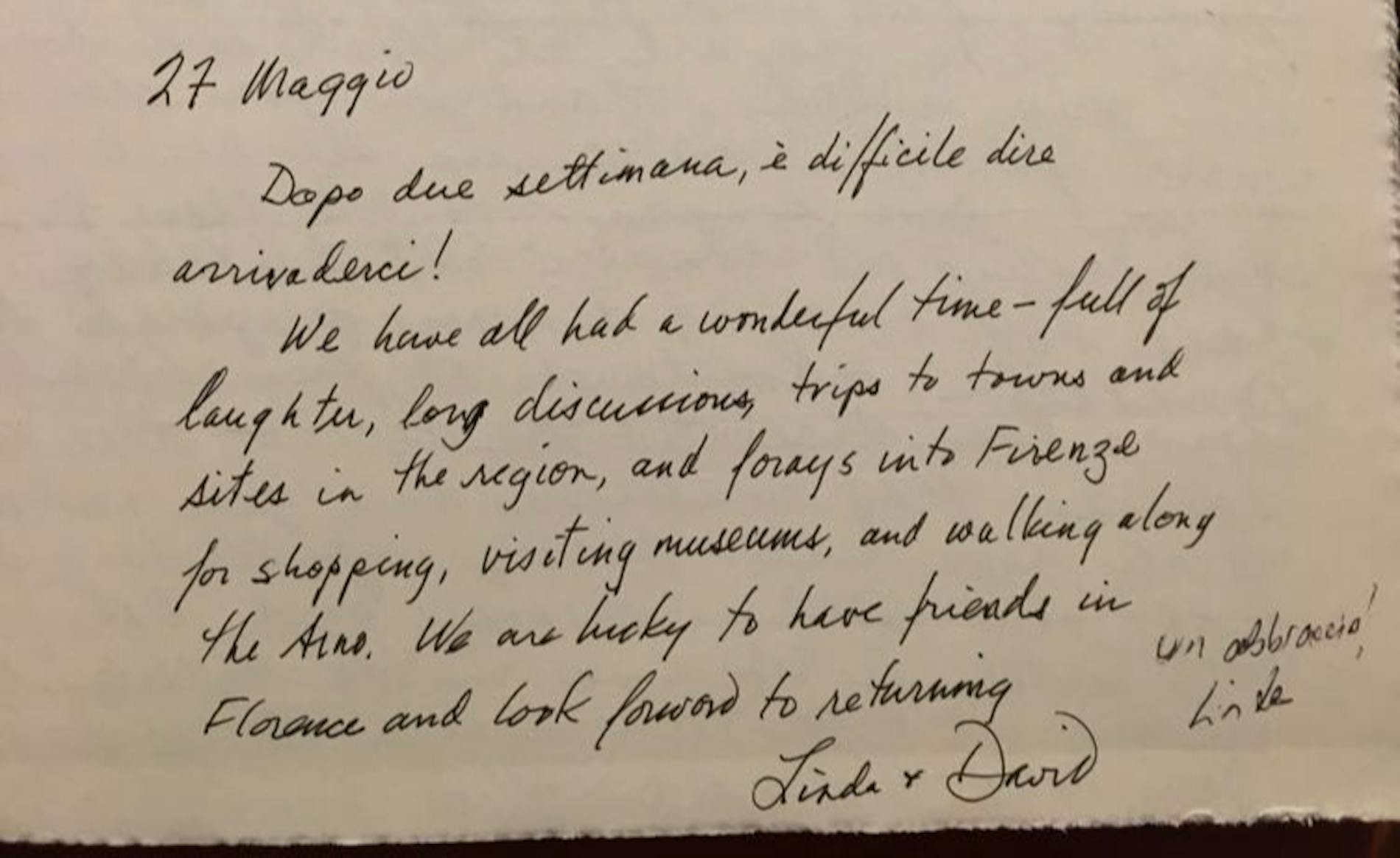 "Dopo due settimane è difficile dire arrivederci! We have all had a wonderful time – full of laughter, long discussions, trips to town and sites in the region, and forays into Firenze for shopping, visiting museums and walking along the Arno. We are luck to ha e friends on Florence and look forward to returning."