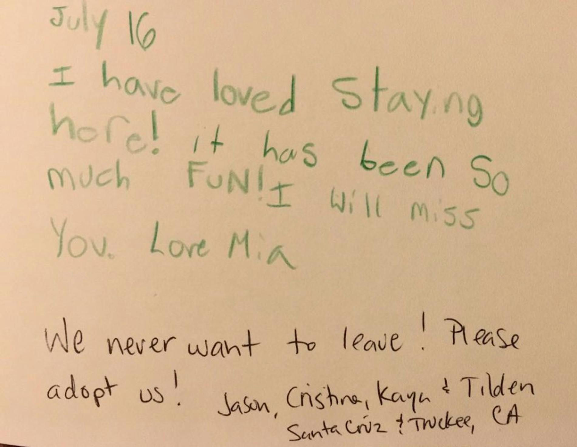 "I have loved staying more! It has been so much fun! I will miss! Love Mia We never want to leave please adopt us!"