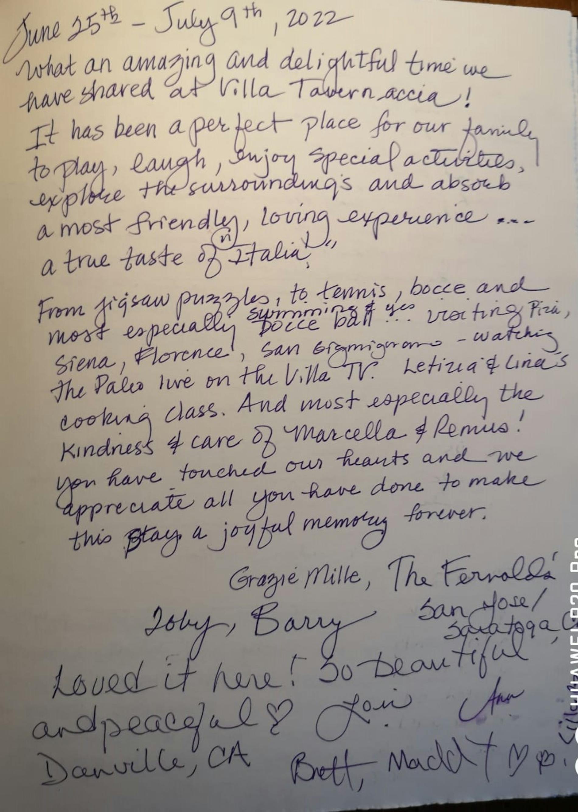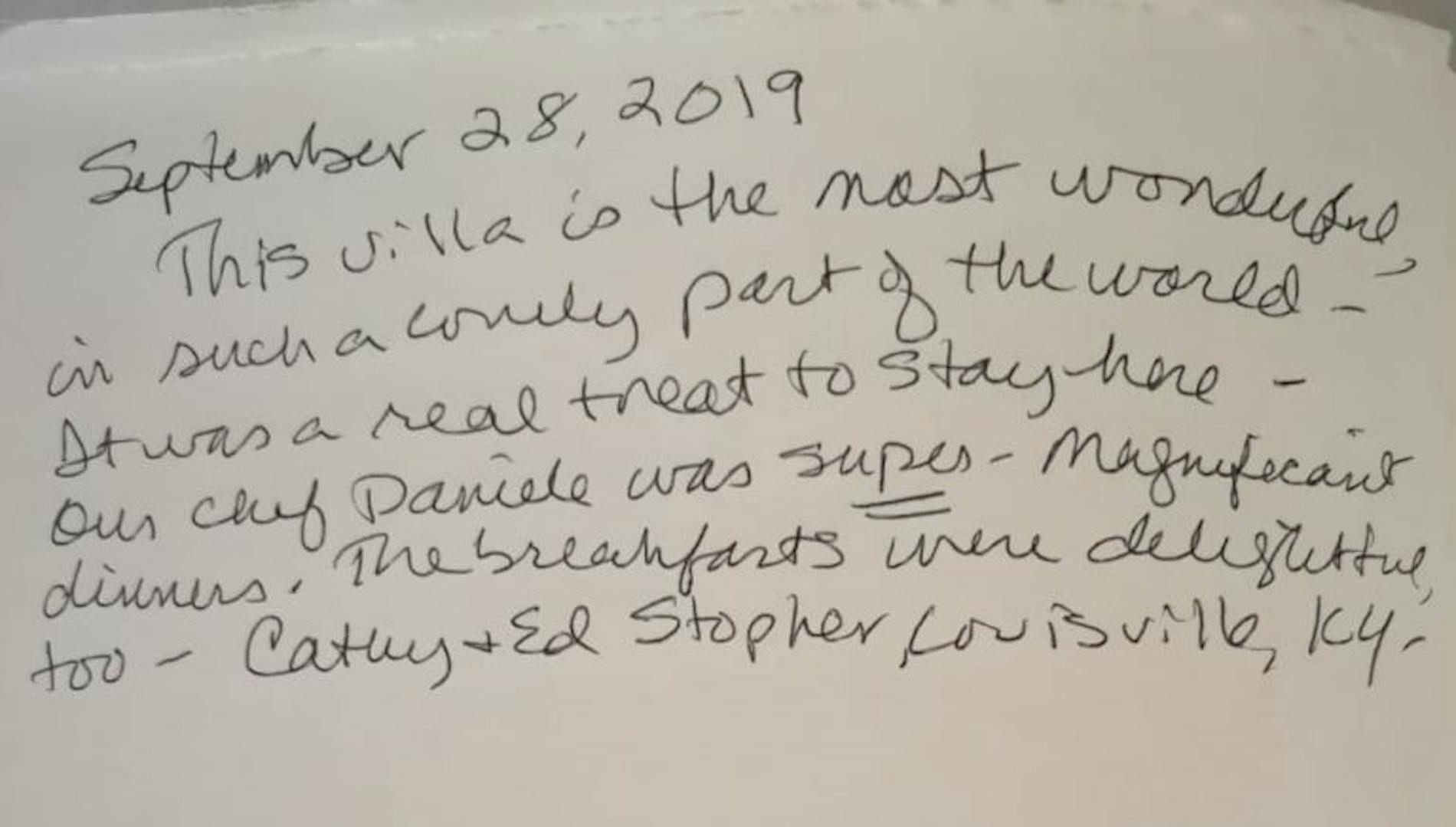 "Dear Carlo and Valentina, what a wonderful Villa you have! We enjoyed our stay. Every detail was perfect, from the lovely decor to the most helpful and wonderful staff. Marcella attended to our every need and Simone is undoubtably the most talented chef I’m sure we will ever encounter. This has been one of the most memorable and enjoyable vacations we have ever had. We are already looking ahead to another magnificent stay at villa Tavernaccia. Till the next visit we wish you all the best."