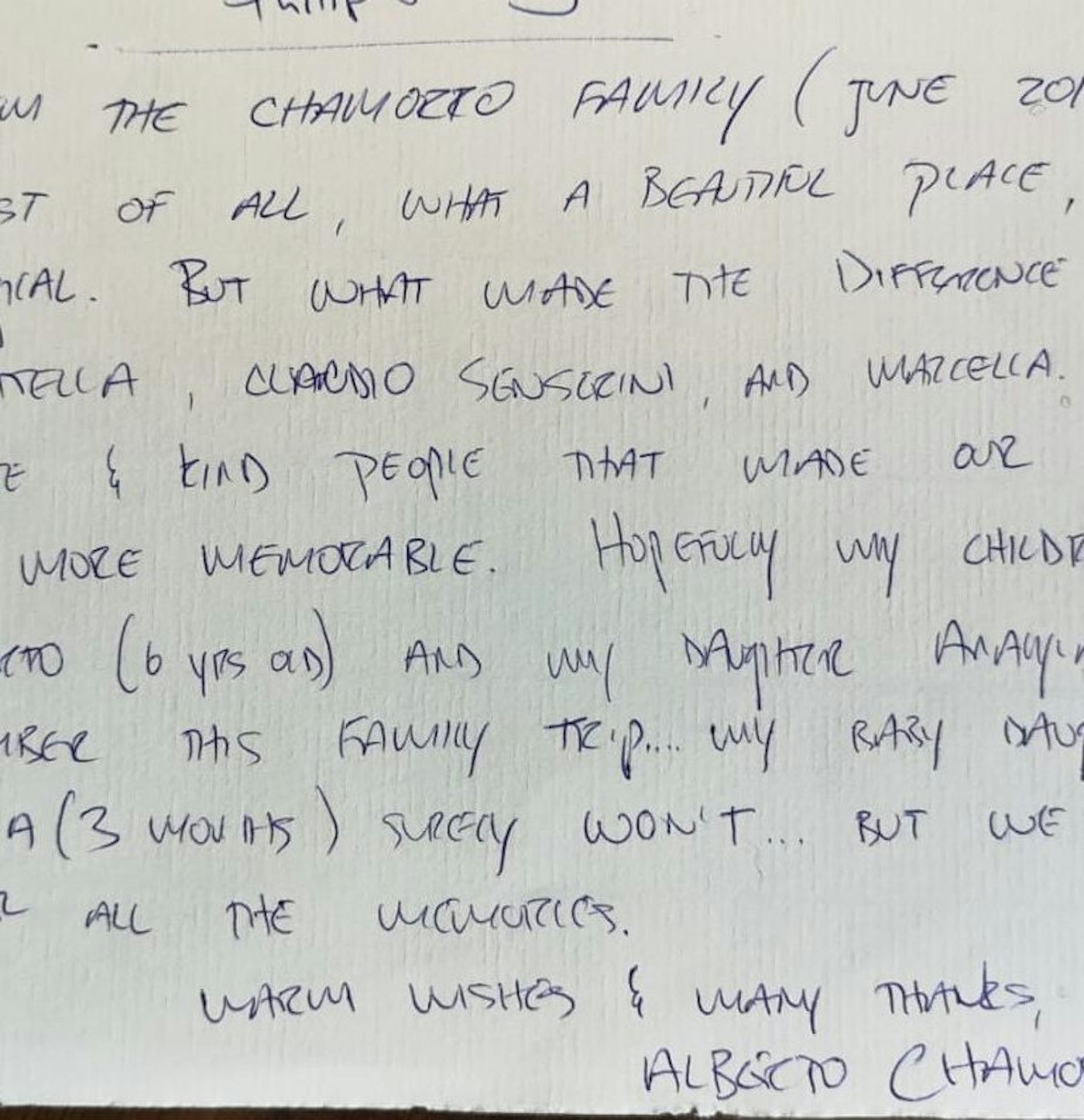 "First of all, what a beautiful place, truly magical. But what made the difference was Donatella, Claudio and Marcella. Very polite and kind people that made our stay even more memorable. Hopefully my children Alberto (6 years old) and my daughter Annamaria (4 years old) remember this family trip. My daughter Martina (three months) surely won’t… But we will remember all the moments. Warm wishes and many thanks."