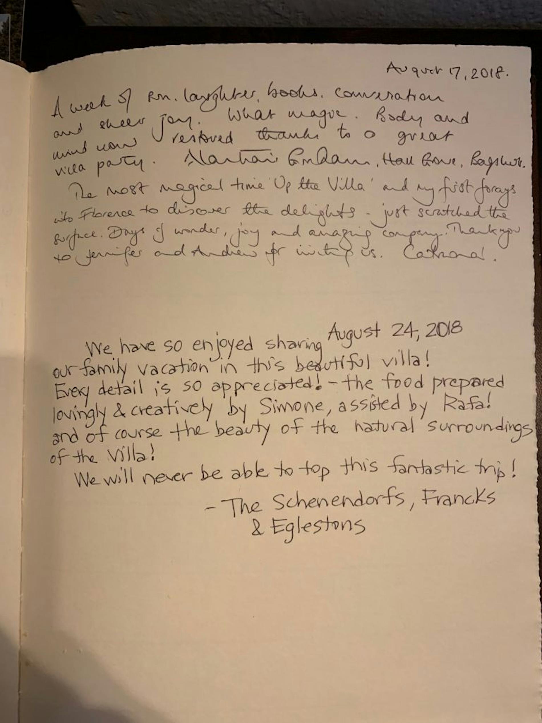 "Dear Valentina, la Tavernaccia will occupy a very dear place in our family’s memories. We would like to thank you and everyone who contributed to making this week so memorable. Your house and its magic garden have welcomed us made us feel immediately at home. Thank you for sharing this treasure with us. Please accept the game of Backgammon as a proof or our intention to return as soon as possible."