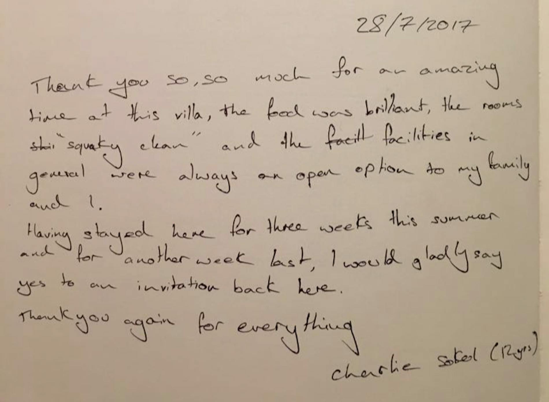 "Thank you so, so much. For an amazing time at this villa, the food was brilliant, the rooms “squeaky clean” and the facilities in general were always an open option to my family and I. Having stayed here for three weeks this summer and for another week last, I would gladly say yes to an invitation back here. Thank you again for everything."