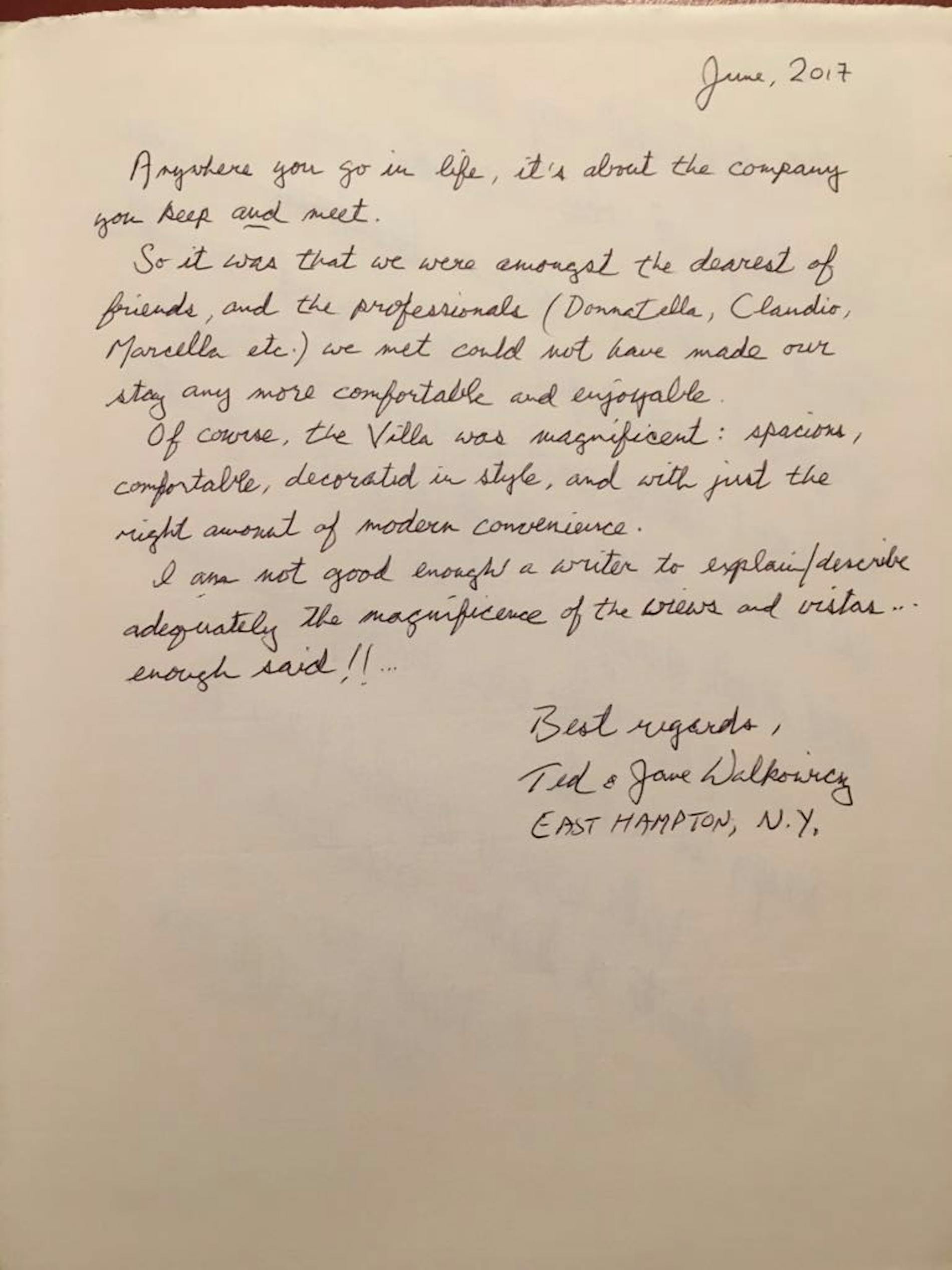 "Una villa magnifica! Grazie mille for sharing this serene estate. The stuff Donatella, Claudio and Marcella so wonderful to our party of ten. The property a cool oasis. A wonderful respite from the rest of the world."