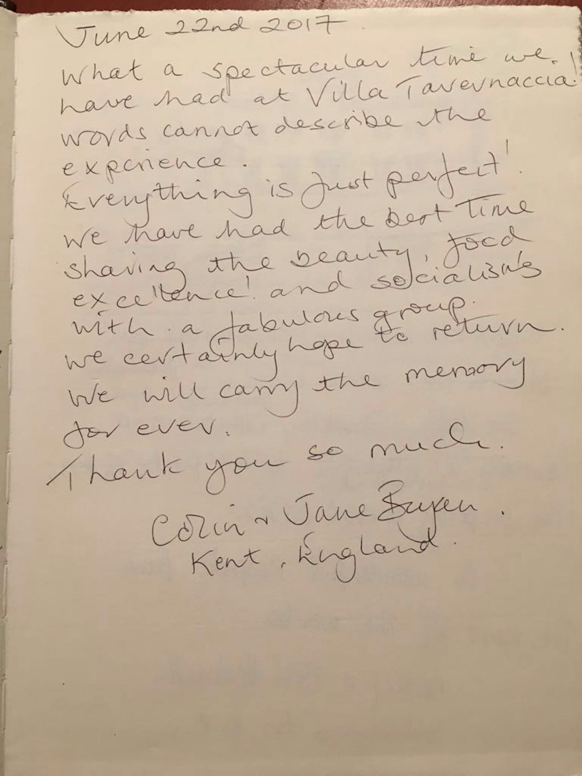 "What a spectacular time we had at Villa Tavernaccia! Words cannot describe the experience. Everything is just perfect! We have had the best time sharing the beauty, food excellence! and socialising with a fabulous group. We certainly hope to return. We will carry the memory forever. Thank you so much."