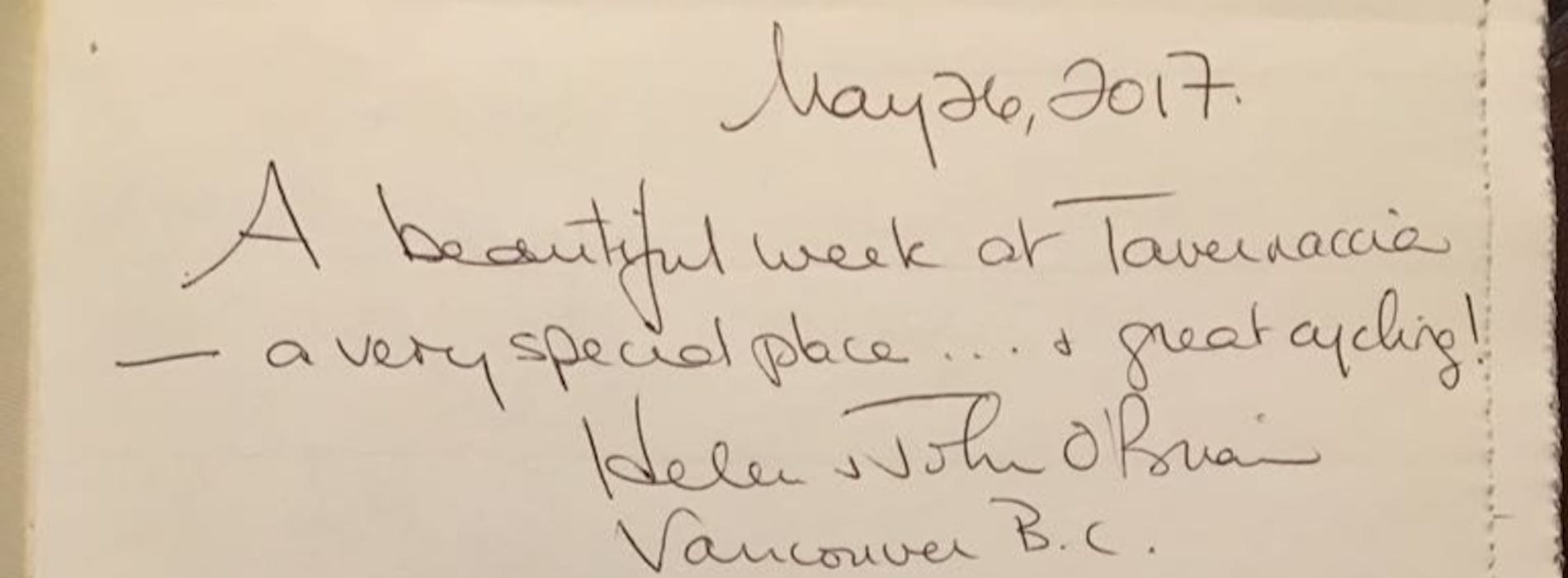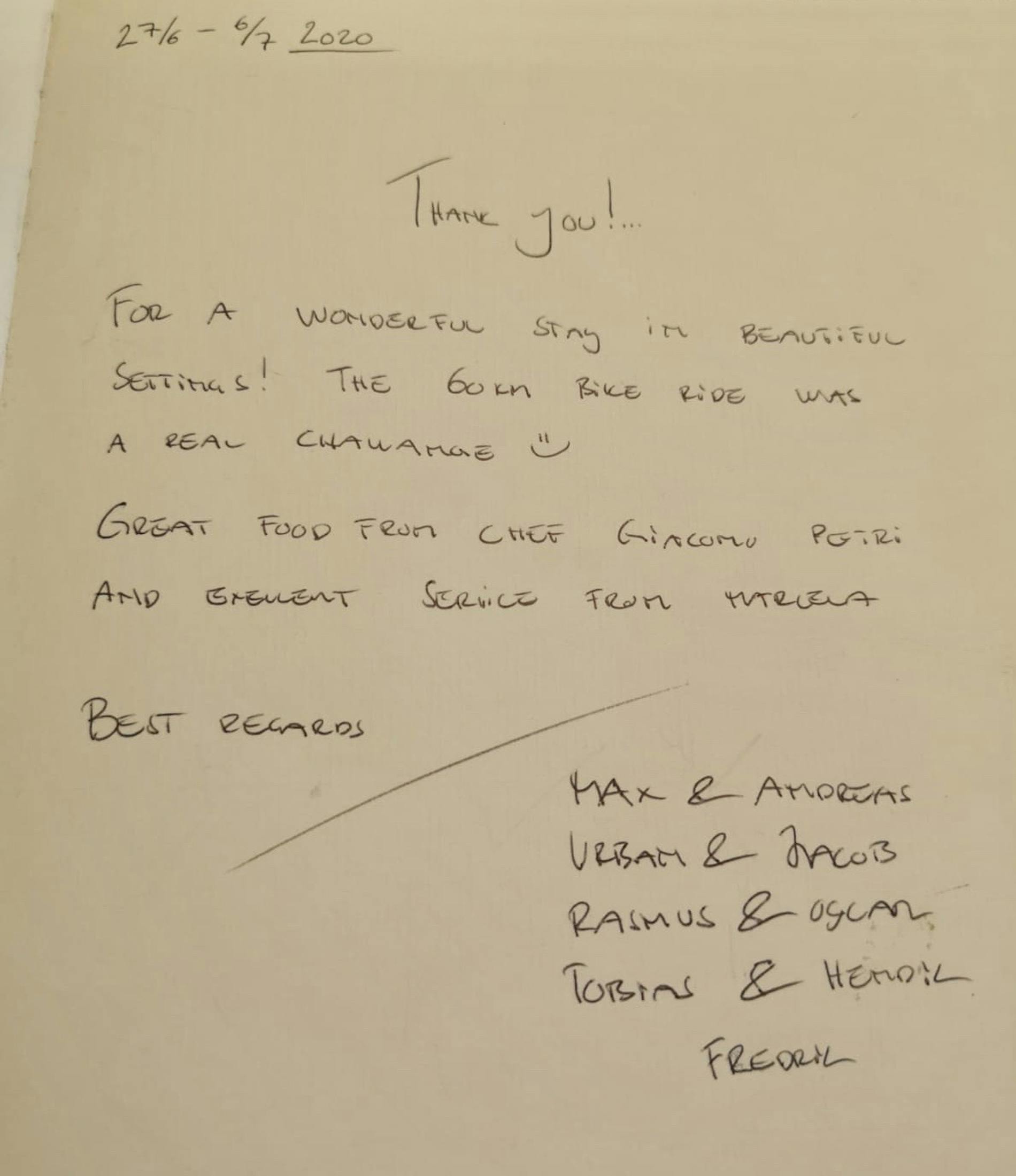 Thank-you! For a wonderful stay in beautiful settings! The 60 km bike ride was a real challenge! Great food from chef Giacomo Petri and excellent service from Marcella. Best regards.