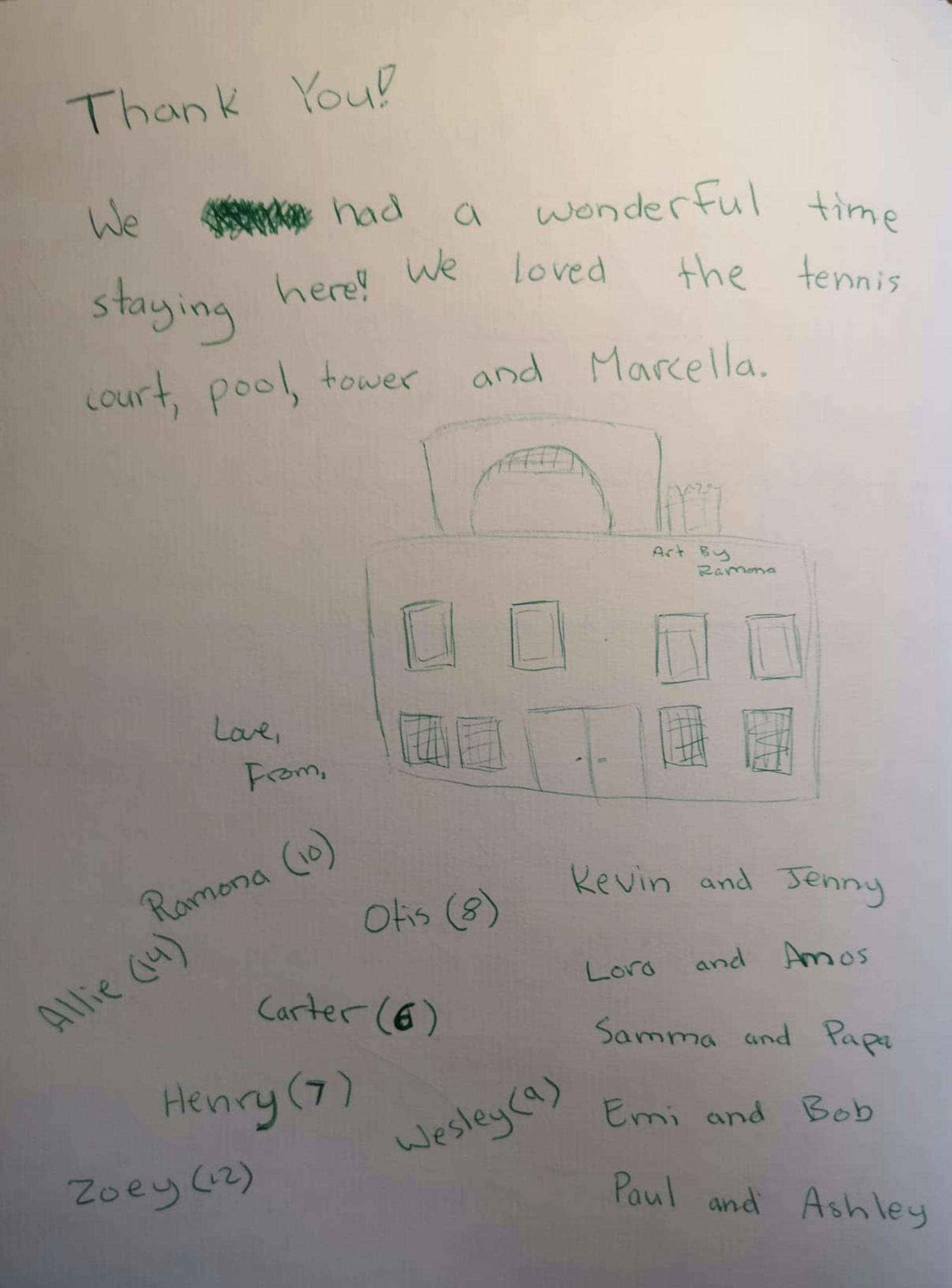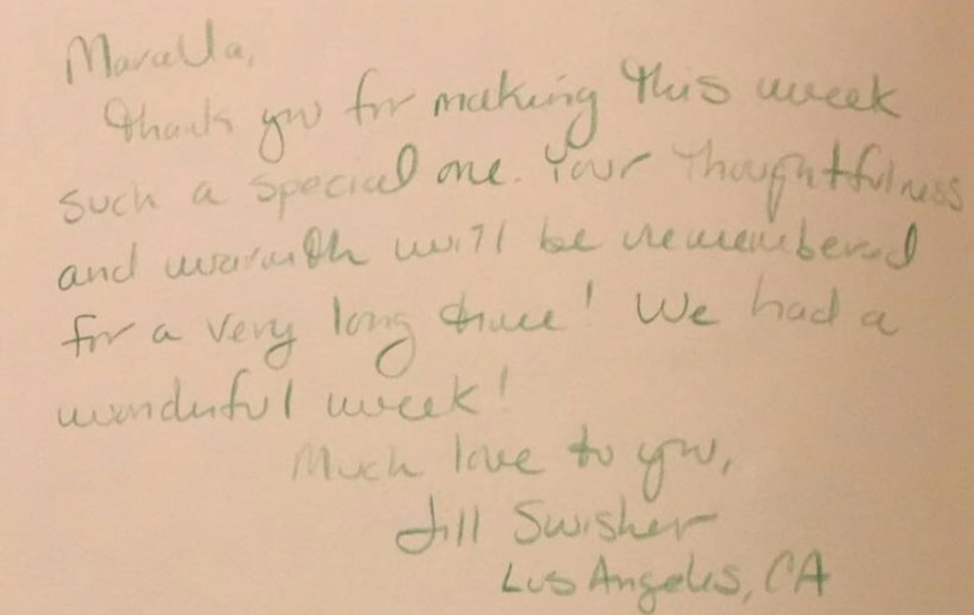 "Marcella, thank-you for making this week such a special one. Your thoughtfullness and warmth will be remembered for a very long time! We had a wonderful week! Much love to you!"
