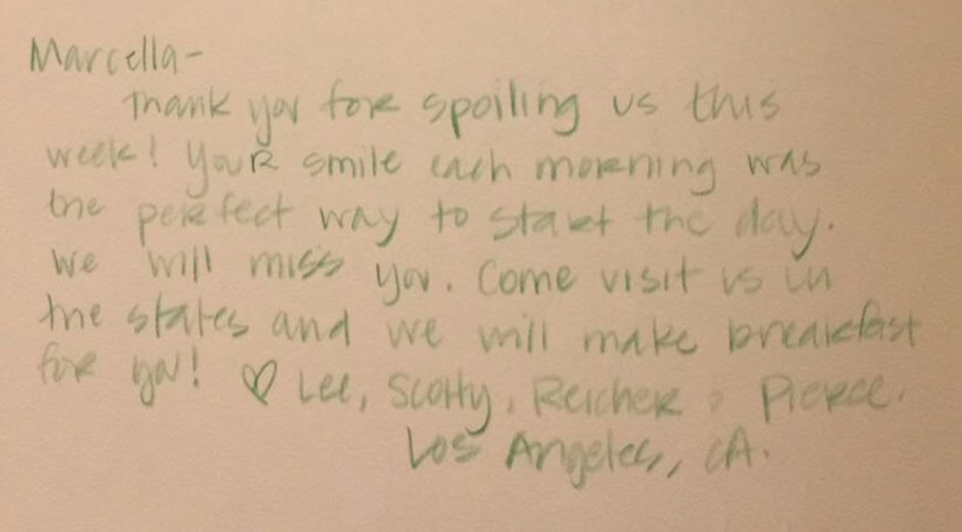 "Thank-you for spoiling us this week, your smile each morning was the perfect way to start the day. We’ll miss you. Come and visit us and we’ll make breakfast for you!"