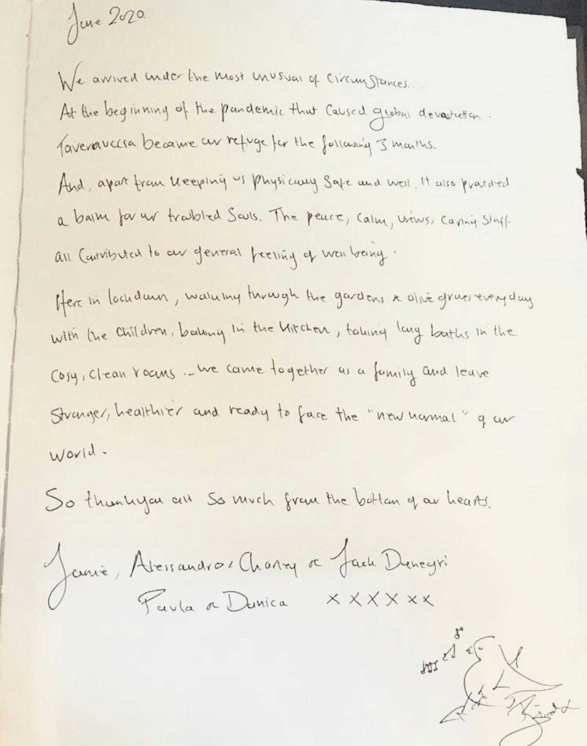 June 2020 We arrived under the most unusual of circumstances… At the beginning of the pandemic that caused global devastation. Tavernaccia became our refuge for the following three months. And apart from keeping us physically safe and well, it also provided a balm for our troubled souls. The peace, calm views, caring stuff, all contributed to our general feeling of well being. Here in lockdown, walking through the garden and the olive grows every days with the children, baking in the kitchen, taking log baths in the cozy, clean rooms. We came together as a family and leave stronger, healthier and ready to face the “new normal” of our world. So thank you so much from the bottom of our hearts.